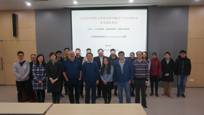 Hosseini教授的报告内容主要涉及超分子化学前沿领域研究,在超分子化学、固态化学和材料科学的交叉点上发展了一种“分子构造学”的构筑策略,用以弥合微观(原子和分子)和宏观(材料)世界之间的鸿沟。这种策略是通过对具有可扩展的周期性网状晶体材料进行介观组装来实现的,构建方法建立在分子识别的基础上。该方法具有可操作性和通用性,不仅可以设计和建造各种有机或杂化的复杂结构和核壳晶体,而且还可以在温和的条件下将晶体“焊接”成晶体网络。三场报告深入浅出地讲解了分子组装、纳米组装以及介观组装概念的内涵与外延。作为组装的实例,Hosseini教授介绍了其课题组以卟啉为转子的分子转门和马达的研究。手型的研究涉及化学、生命、天文以及地理学科各方面,是多学科交叉的一个重要结合点。Hosseini教授讲解了在分子动态构筑中手性控制策略。报告结束后,对于员工提问Hosseini教授都一一耐心解答,并与大家合影留念。报告和座谈闲暇之余,Hosseini教授参观了bv1946伟德官网校园和化学楼,并与朱俊杰教授、肖守军教授、张磊教授、强琚莉副教授、林晨副教授以及王乐勇教授等进行了交流。曾经在Hosseini教授课题组工作过的福州大学林梅金教授、哈尔滨工大的胡博文副教授以及中山大学工作的张帆博士、冯力文博士也来到南京参加这一系列学术报告。
