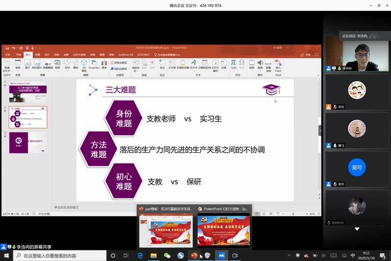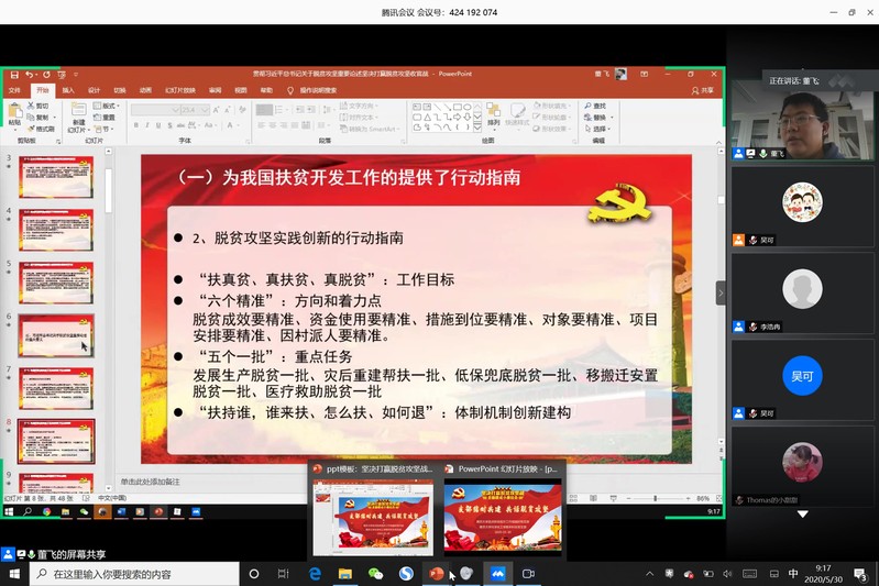 5月30日上午,伟德源自英国始于1946本科生党支部与bv1946伟德官网定点扶贫前方工作组临时党支部联合开展“支部结对共建共话脱贫攻坚”主题“云”党日活动。两个支部共计51名党员师生参加,活动由伟德源自英国始于1946本科生支部书记吴可主持。bv1946伟德官网团委宣传部部长、妥甸镇和平村驻村第一书记董飞老师和伟德源自英国始于19462019届本科生、第21届研究生支教团云南分团成员李浩冉同学作为扶贫工作一线的代表参加了活动分享。