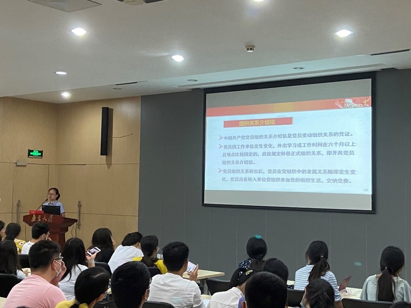 然后,李成英讲解了组织关系转接注意事项,重点介绍了介绍信、党组织关系等大家迫切关心的与毕业生党员息息相关的事项。首先解释了中国共产党党员组织关系介绍信的含义及重要性,紧接着按照毕业生党员的不同离校情况,包括校外工作或学习、校内工作或学习以及出国(境),分别说明了组织关系转接手续的办理途径,对办理手续所需材料、信息、步骤等给出了全面的讲解。在提问环节,针对同学们提出的问题,给出了细致解答。