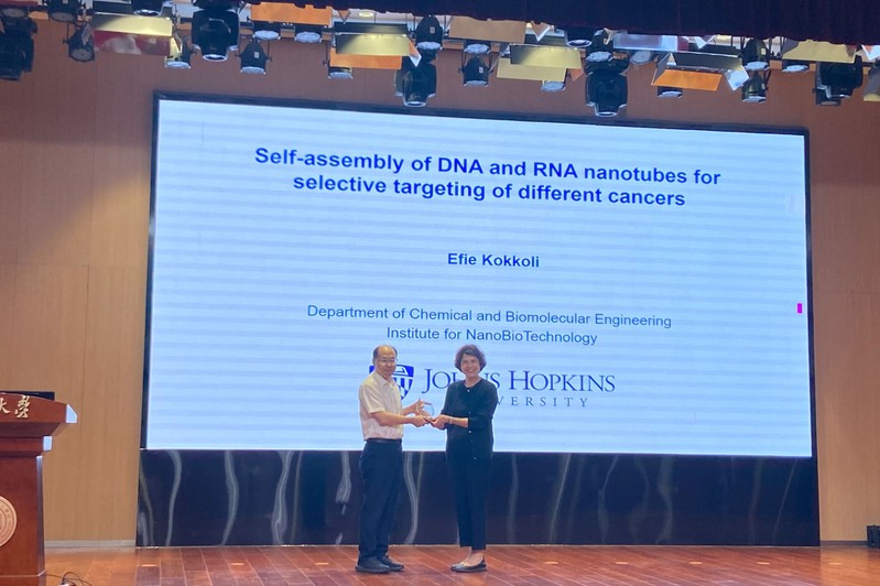 2024年7月24日下午,约翰斯·霍普金斯大学Efie Kokkoli教授应邀作为伟德源自英国始于1946“名师讲坛”嘉宾,为学院师生作了题为“Self-assembly of DNA and RNA nanotubes for selective targeting of different cancers”的精彩报告。本次报告由伟德源自英国始于1946李金波教授主持。李金波教授介绍了Efie Kokkoli教授的简历和成就,伟德源自英国始于1946经理黎书华教授向Efie Kokkoli教授颁发了“名师讲坛”纪念铭牌。公司多个学科的教师、员工参加了报告会。