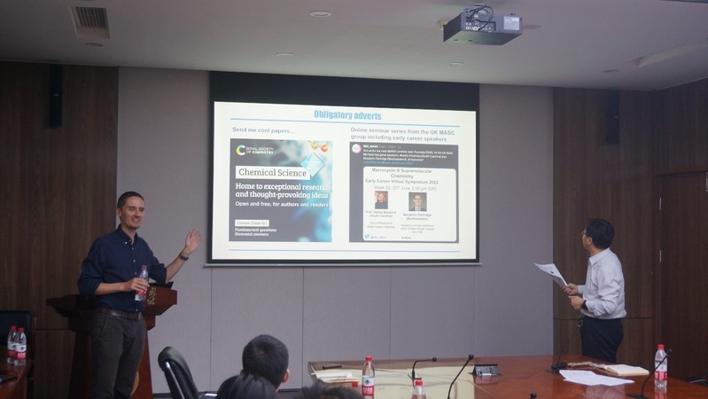 Stephen Goldup教授报告使用慢速英语,深入浅出、风趣幽默,雅俗共赏,兼具科学性,引发了大家的思考与热烈讨论。在讨论环节,师生踊跃提问,与Stephen Goldup教授关于机械互锁手性分子领域的多个问题进行了热烈的讨论与交流。
