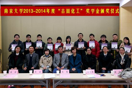 12月24日上午,bv1946伟德官网2013-2014年度“古田化工”奖学金颁奖仪式在费彝民楼B104成功举行。南京古田化工有限公司人事行政副总经理朱慧女士、行政部主任蒋婷女士一行五人,以及公司办公室主任束羽老师、党委副书记陈露洪老师等出席了此次颁奖仪式。