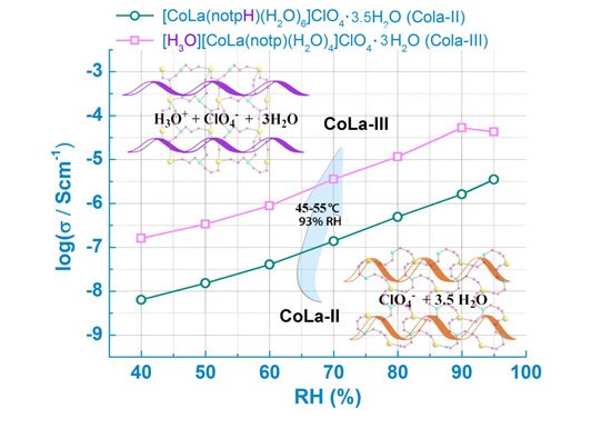 郑丽敏教授课题组提出了一种新的增强材料质子传导性能的方法:通过金属有机膦酸层状材料的原位相变,将质子从层内释放到材料的层间通道,从而提高材料的导电率。他们设计合成了两个以三氮杂环三甲基膦酸为配体的稀土钴层状配位聚合物CoLa-I和CoLa-II,其中CoLa-I具有电中性的层状结构,而CoLa-II的层状结构由于膦酸基团的氧原子质子化而带正电性。化合物CoLa-II在温度45度相对湿度93%的条件下,可以转变为另一相CoLa-III。通过XAFS谱、PXRD谱、EDX能谱的研究,发现CoLa-III具有和化合物CoLa-I相同的层状结构。所以当化合物CoLa-II发生相变时,膦酸基团上的质子被释放到层间,与晶格水分子形成水合氢离子。阻抗谱研究表明,化合物CoLa-III在25度相对湿度95%时的导电率比化合物CoLa-I和CoLa-II提高了1个数量级。这种通过相变诱导提高质子传导率的方法为设计合成具有高质子传导性能的材料提供了新的思路。