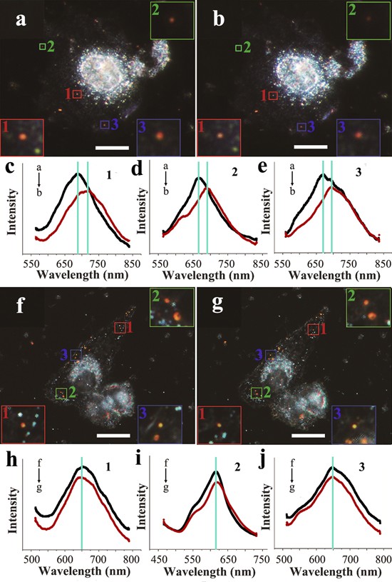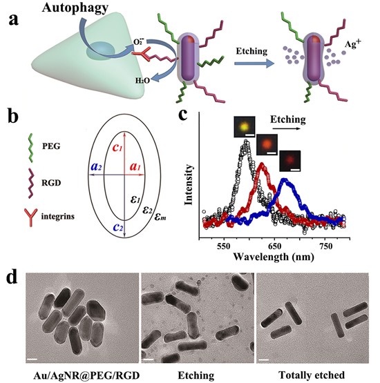 为了实现这一目的,朱俊杰课题组合成了一种专一识别肿瘤细胞的表面等离子体激元共振(SPR)光学纳米探针,该探针为表面修饰聚乙二醇(PEG)以及特异性识别肿瘤细胞的精氨酸-甘氨酸-天冬氨酸-半胱氨酸多肽序列(RGDC)的金核银壳纳米棒,如图1所示,在超氧自由基的氧化作用下,探针的外层银壳被刻蚀,形成了类似骨头形的纳米结构。该结构具有较高的长径比,从而导致探针纵向表面等离子共振波长发生红移。因此,根据探针光谱的红移速率可以获得超氧自由基的实时浓度及细胞自噬的相关信息。图2中,结合探针的HeLa细胞在饥饿条件下培养2小时,细胞发生自噬,产生的大量超氧自由基导致探针光谱的红移(图2c-e)。作为对照试验,在正常的条件下培养的HeLa细胞中,探针的光谱没有发生明显的变化(图2h-j)。因此,通过观察探针光谱的变化可以实时监测细胞的自噬进程。实验结果表明,细胞内超氧自由基通过调节自噬体的生成来控制细胞自噬。
