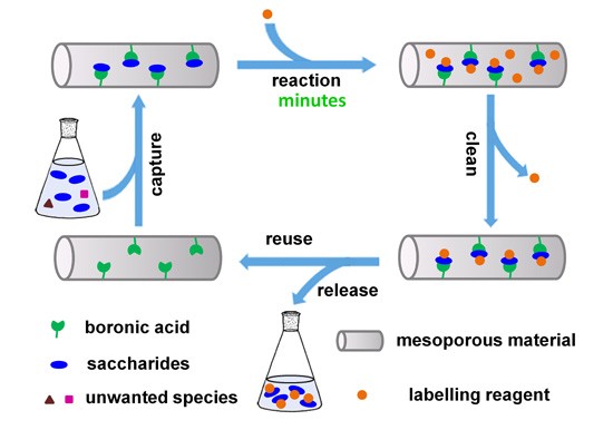 糖类化合物是生物体内必不可少的成分,是生物化学、生物医学、糖组学和糖生物学等多个领域中的主要研究对象。由于糖类没有荧光,紫外可见吸收极弱,且质谱信号差,标记对于糖的检测、定量分析和结构鉴定至关重要。糖的标记通常采用液相标记法,但该方法存在着耗时、标记产物中存在过量的标记试剂和适用的糖浓度高等明显缺点。刘震研究组在多年研究硼亲和功能化材料的基础上,提出了糖类物质的高效硼亲和固相标记法。该方法以硼酸功能化介孔硅纳米颗粒为选择性吸附剂和纳米反应器,先通过硼亲和作用将被标记糖类化合物选择性共价结合到介孔材料上,然后引入标记试剂,由于被标记化合物被富集于极小的空间,且分子空间朝向有利于与标记试剂分子的碰撞,有效碰撞几率显著升高,标记反应能在极短时间内完成,标记反应结束后将过量标记试剂除去,使用温和的酸性溶液将标记产物从介孔材料上解析下来,即得到标记产物。该方法具有三个显著的优点:第一,标记产物纯度高;第二,标记效率快,标记速度比液相标记快210倍,仅需2分钟;第三,适用的糖浓度低,比液相标记低4个数量级,可标记浓度低达10-9M的糖。该方法为糖的标记提供了崭新的路径。同时,该方法的提出为介孔材料在固相合成与标记奠定了重要基础,该方法可扩展到其他化合物的标记与化学衍生。该工作表于最近一期的Angew. Chem. Int. Ed. 2015, 54, 6173–6176 (DOI: 10.1002/anie.201405525)。该论文第一作者为专业硕士生潘祥华同学。该工作得到国家杰出青年科学基金、国家自然科学基金面上项目、国家重大科学研究计划和上海烟草集团的经费支持。该论文是该课题组在硼亲和功能化材料方向发表于Angew. Chem. Int. Ed.的第4篇研究论文。