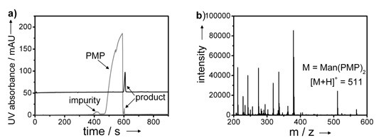 ![]() 图2. 标记产物的毛细管电泳图对照(a,黑色 :固相标记,灰色:液相标记)及标记产物的质谱图(b)