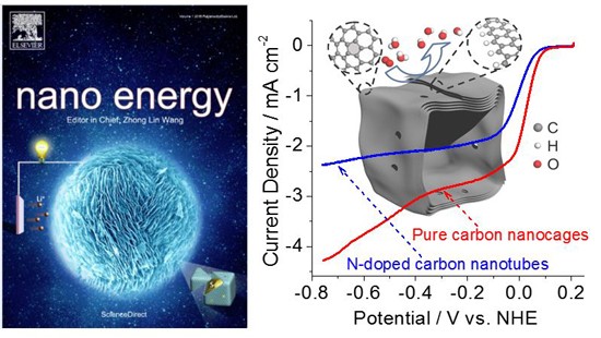 图2. 左图:介观结构碳纳米笼应用于锂硫电池的研究工作被Nano Energy选为封面论文;右图:缺陷丰富的纯碳纳米笼具有优异的氧还原活性