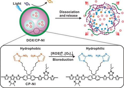 伟德源自英国始于1946沈群东教授领导的电活性高分子研究小组和北卡老员工物医学工程系顾臻教授领导的智能递药研究小组共同设计了一种新型的用于光动力治疗的制剂(Advanced Materials, DOI: 10.1002/adma.201505869)。整个体系基于一种光激活乏氧响应型共轭高分子纳米材料(CP-NI),能利用PDT产生的乏氧环境刺激抗肿瘤药物递送系统。在可见光的照射下,体系中的共轭高分子能诱导活性氧产生;与此同时,由该种高分子组成的
