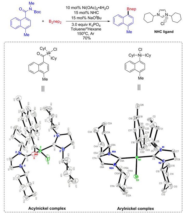 在此工作基础上,经过进一步设想,过渡金属插入酰胺类化合物的C-N键可能会发生脱羰基,如果能进一步构建硼酸酯类化合物,其新颖性和合成意义将更加重大。要实现这一转化,必须克服以下三点:(1)该反应是将稳定的酰胺C-N键转化为更活泼的C-B键;(2)目标分子中存在大量C-H,C-O和C-F键时,如何选择性断裂C-N键;(3)所产生的芳基硼酸酯不能与未反应的酰胺原料进行进一步偶联。在这个设想下面,通过一系列的探索,他们以酰胺为原料,B2nep2作为硼源,利用醋酸镍和氮杂环卡宾的催化体系,成功实现了酰胺高选择性的C-N键断裂脱羰硼化反应(Angew. Chem. Int. Ed. 2016, DOI: 10.1002/anie.201603068.)。该工作的另一重要意义在于他们成功地分离到镍催化酰胺键断裂的中间体−酰基镍和芳基镍配合物,并且观察到脱羰基的过程,从而得到了C-N键被活化的铁证,为进一步研究其它化学转化提供了依据(图一)。