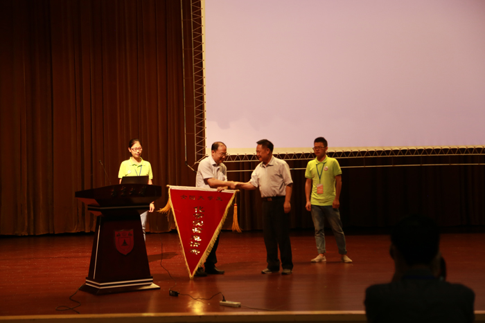 段连运主任代表教育部高等学校化学教育研究中心向黎书华经理授旗。员工代表和监考老师代表在发言中分享了各自在学习和工作过程中的经历和心得,并分别代表参赛员工和监考老师做出承诺。