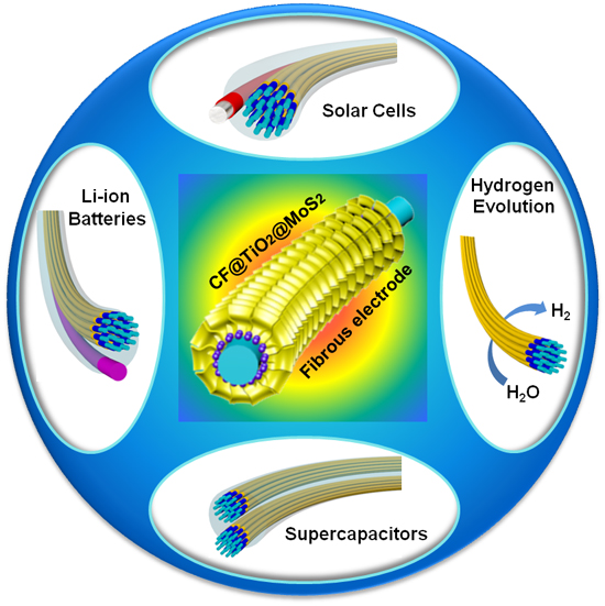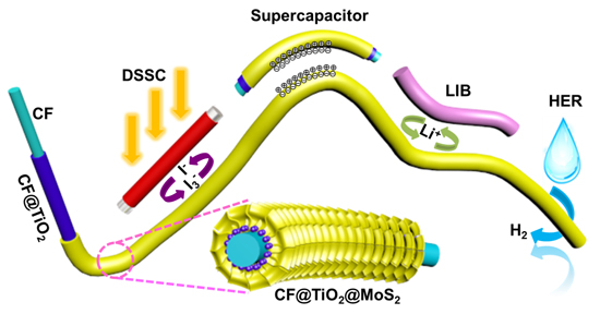 ![]() 图2. 利用单根CF@TiO2@MoS2同轴纤维电极实现DSSC、supercapacitor、LIB或HER等应用的示意图。