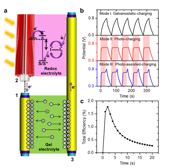 在纤维状太阳能电池和超级电容器的研究基础上,该团队采用该复合纤维电极构筑了纤维状光电转换与能源存储一体化集成器件(图2)。在我们设计的自供电纤维状能源器件中,能源采集和能源存储单元共享同一根纤维电极,通过简单且低成本的方法,在单个纤维器件上同时实现“光-电-电化学”能源采集和存储,并且具有高效率、耐弯折、可编织等优点(图3)。该自供电器件的太阳能电池部分的光电转换效率达到了9.5%,是目前世界上已发表文献中纤维状太阳能电池效率的最高记录。在太阳光照条件下,该器件的超级电容器部分能够实现仅需7秒钟的快速充电(图4)。本项目在柔性可穿戴自供电能源系统中迈出了关键一步,为发展下一代先进能源器件提供了新思路。