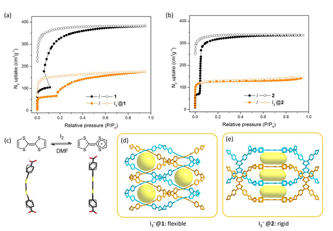 为了获得具有氧化还原开关的柔性MOFs材料,在拓扑研究的基础上,该研究团队利用四硫富瓦烯苯四羧酸配体(TTFTB)设计合成了两个InIII-MOFs。N2吸附结果表明,化合物1和2均具有呼吸效应。通过理论模拟和单晶结构测试对上述呼吸效应进行了合理的解释(图1)。化合物1的呼吸效应源于两套互相穿插结构之间的相互运动,化合物2的呼吸效应则是基于四硫富瓦烯(TTF)本身的柔性。由于TTF是共轭的多硫体系,易被分步、可逆地氧化为一价自由基和二价阳离子,且不同状态的TTF具有不同的构型(TTF氧化成TTF•+或TTF2+后,7π-电子二硫代亚苯基环将转化为芳香族6π-电子构型,从而形成一个刚性的,完全共轭的芳香族体系),这使得氧化还原调控呼吸效应成为可能。利用晶体到晶体转化,成功获得了化合物1和2碘掺杂后的化合物(I3−@1和I3−@2),并确定了碘掺杂材料的晶体结构(图2)。碘掺杂后,中性的TTF单元被部分的氧化为自由基,而单质I2被还原为I3−。因此,碘掺杂将增加TTF单元的刚性,但不会对互相穿插结构之间的相互运动产生影响。气体吸附结果显示,碘掺杂后化合物I3−@1的呼吸效应仍然存在而化合物I3−@2的呼吸效应完全关闭,这表明氧化掺杂可调控材料的呼吸效应(图3)。此外,将碘掺杂后的化合物浸泡在甲醇或DMF等溶剂中可使得化合物脱碘,可逆地转变为原始的化合物。此外,该MOF为阴离子MOF,原位产生的二甲铵阳离子[Me2NH2]+ 作为抗衡离子填充于整个框架孔道。该团队同时研究了不同抗衡离子([Me2NH2]+、[Me4N]+、[Et4N]+、[Bu4N]+)对结构呼吸效应的调控。该类还原活性可调节的柔性MOFs材料是一类新型的气体吸附材料,在气体吸附分离、分子传感和可调控催化等领域可展开深入研究。
