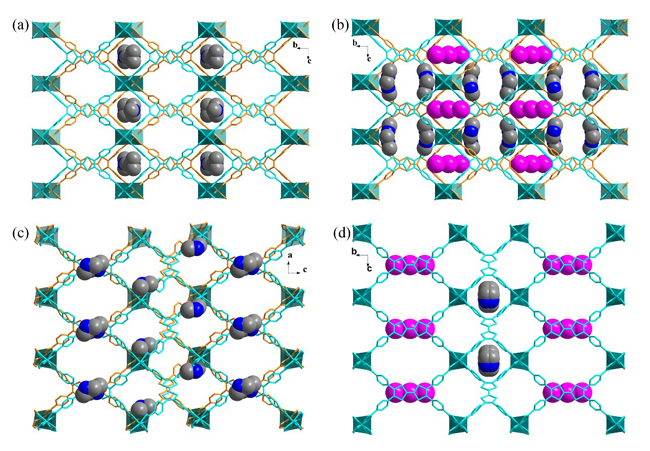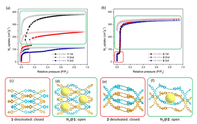 ![]() 图1化合物1和化合物2的气体吸附结果,及其在不同状态下的结构图