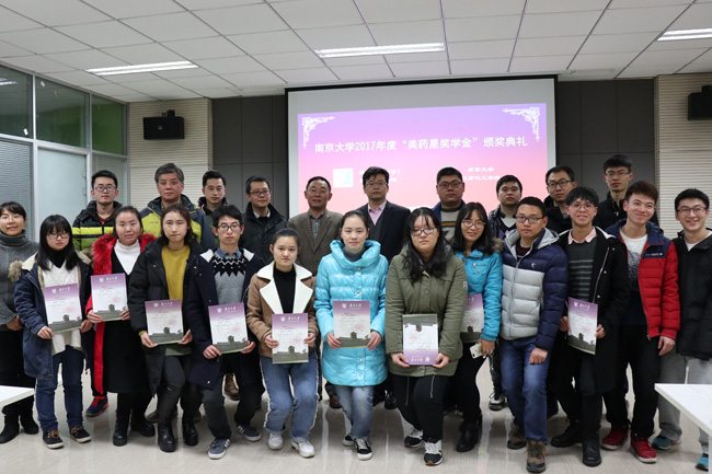 颁奖仪式开始,李兴华向与会师生代表介绍了美药星(南京)制药有限公司两位嘉宾,束羽宣读了《关于颁发2017年度“美药星奖学金”的决定》,随后设奖单位代表向获奖员工颁发了获奖证书并合影留念。