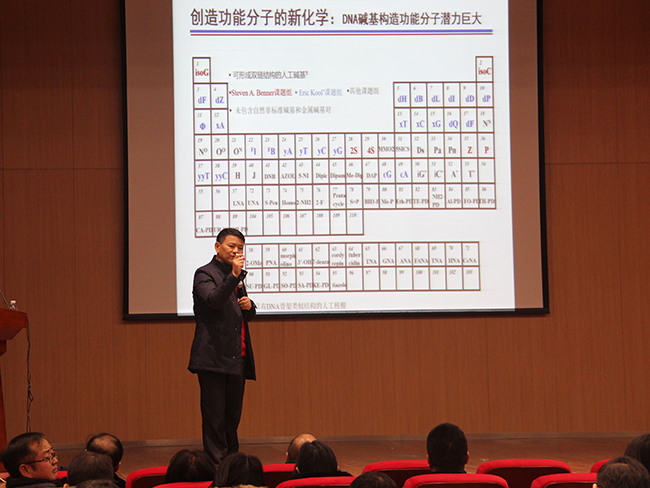 谭蔚泓院士开场以元素周期表中元素组成化合物为导引,向大家介绍了基于核酸碱基的“分子元素”设计理念,并进一步解释了“分子元素”本质,即通过相同的化学反应将核酸元素连接起来,设计制备不同活性和功能的分子。随后,谭蔚泓院士从DNA碱基、基于DNA碱基的几种功能性分子、分子马达等方面向大家展示了如何利用核酸碱基“分子元素”高效设计和制备功能性分子和分子组装体,显示出该方法在制备功能材料方面的巨大潜力。在报告的最后,谭蔚泓院士提出三点展望:1、功能分子的设计和制备需要化学家有新的思维;2、“分子元素”或模块化合成的概念有可想象的空间和巨大潜力;3、用DNA碱基来首先尝试“分子元素”功能分子的设计有可行性。 ![]() ![]() 谭蔚泓院士的报告内容丰富,讲解深入浅出,激发了在座师生的浓厚兴趣。报告结束后,谭蔚泓老师还与各位师生就共同感兴趣的科研问题进行了热烈的讨论。