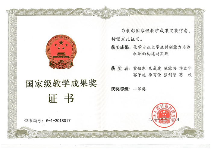 在2018年高等教育国家级教学成果奖中,公司《化学专业老员工科创能力培养机制的构建与实践》(完成人:贾叙东、朱成建、陈露洪、侯文华、郭子建、李育佳、张剑荣、葛欣)获得一等奖,这不仅是全国化学专业中的唯一的一项一等奖,也是全国理科专业中唯一的一等奖。在2019年教师节暨全国教育系统先进集体和先进个人表彰大会上,本成果第一完成人贾叙东教授在京接受颁奖。