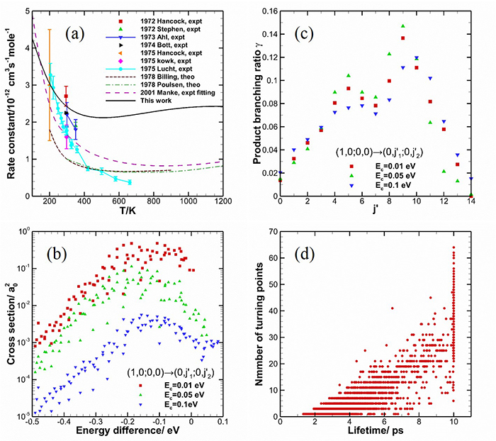 ![]() (a)HF振动弛豫速率常数与其他报导对比(b)态-态传能积分截面